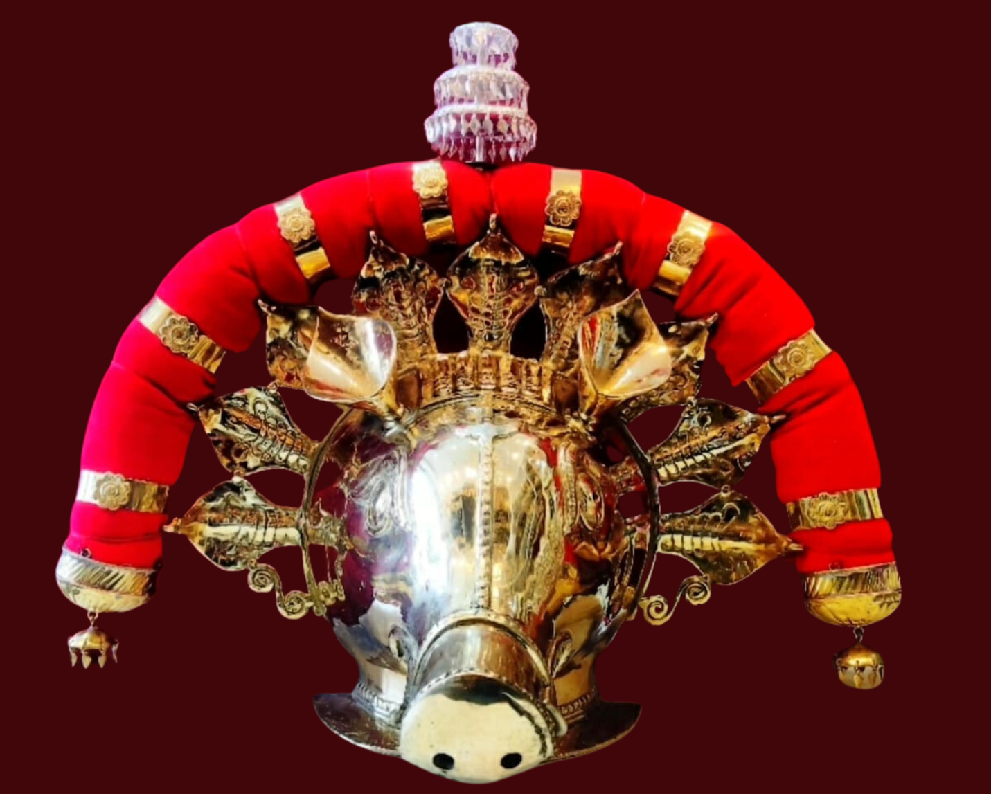 This striking Panjurli idol, decorated with a bold red cloth, embodies the spirit of protection and prosperity. The boar-faced design is deeply rooted in folklore and local traditions. Its polished finish and grand style make it a symbol of divine guardianship.